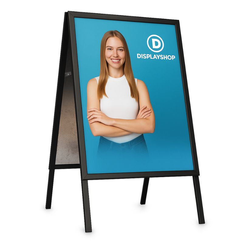 Dit elegante, zwarte stoepbord, behorend tot onze 25mm profiel collectie, is het toonbeeld van draagbaarheid en duurzaamheid. Specifiek ontworpen voor eenvoudige verplaatsbaarheid, is dit klapbord ideaal voor dynamische commerciële ruimtes zoals winkelcentra, beurzen of interne winkelruimtes.