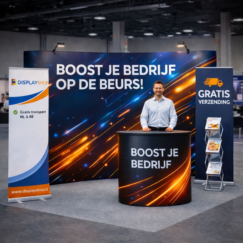 Wil je maximale impact op de beursvloer zonder gedoe? Met deze complete beursstand creëer je in no-time een professionele presentatie die direct opvalt en vertrouwen uitstraalt.