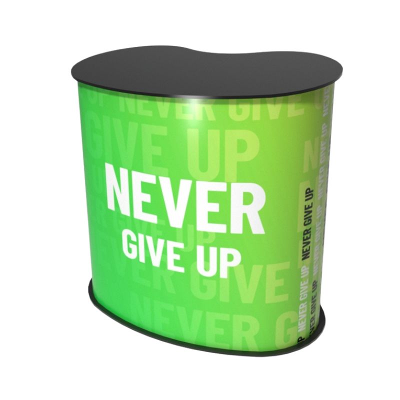 De grote gebogen achterwand van 400×230 cm vormt het visuele middelpunt van je stand. In combinatie met de roll-up banners, counter en folderhouder presenteer je jouw merk overzichtelijk, professioneel én overtuigend.