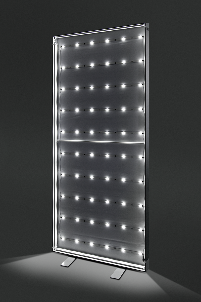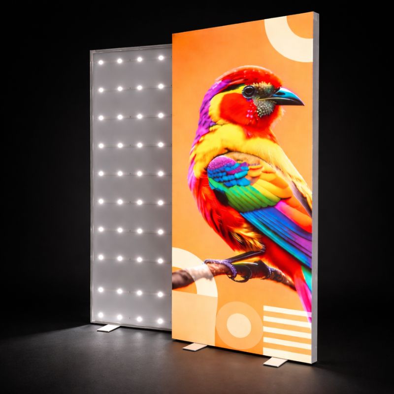 De lightbox maakt gebruik van SEG (Silicone Edge Graphics), waarbij het doek strak in het frame wordt gespannen. Dit zorgt voor een naadloze presentatie zonder zichtbare randen.